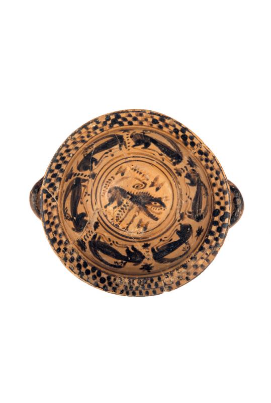 The decoration on the outside of the vase is limited to common geometric motifs (cross-hatched triangles and checkerboard). On the inside, however, animal figures fill most of the surface: depicted in the tondo is a roaring lion, whose bared teeth, lolling tongue and large eyes compound its ferocious aspect; encircling the lion is a frieze of six antlered deer (or horned caprines), couchant and turning their heads backwards. Lions appear very rarely in Attic vase-painting prior to the Late Geometric II period (735-700 BC). Moreover, the motif of the couchant deer turning the head backwards is identified only in representations of the same period. The lion’s spiraling tail imitates Assyrian models, while the concentric zones of animals inside the vase brings to mind Phoenician metal bowls of the 9th and 8th c. BC, which may have been taken as models. The vase is attributed to an Attic workshop and specifically to the final phase of the workshop conventionally known as that of the Hirschfeld Painter.