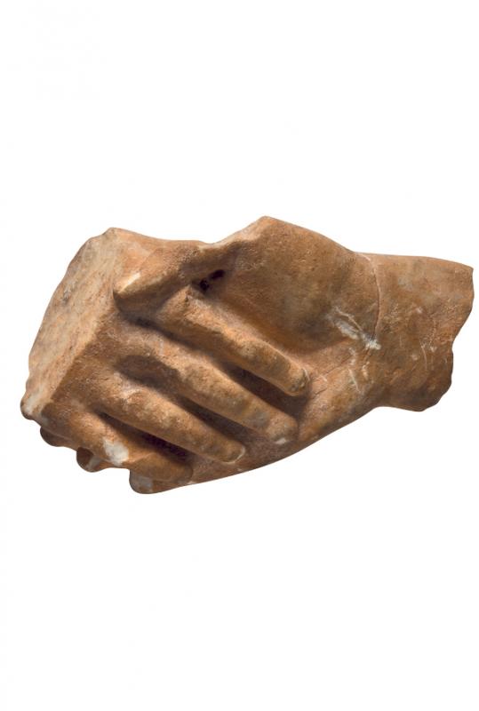 This relief fragment with a representation of a handshake comes from an Attic grave stele with a scene of dexiosis (valediction). Such scenes depict the deceased, usually seated but sometimes standing, to whom a standing relative bids farewell. Sometimes, there is a third standing figure, behind or between them. The dexiosis was the commonest iconographic subject in Attic grave reliefs after 430 BC (when the production of such stelai recommenced after the ban on erecting sumptuous funerary monuments imposed by Kleisthenes in 508/7 BC). It is considered to symbolise the valediction of the dead by his relatives, or perhaps the reunion in the Nether World of those whom death had parted. The first suggestion seems more plausible because seated figures are usually shown as elderly, and standing ones as younger. Some researchers maintain that this particular subject was meant to confirm the family ties between the figures portrayed and to emphasise kinship relation at a time when citizenship in Athens was granted only to men born of an Athenian mother to an Athenian father.