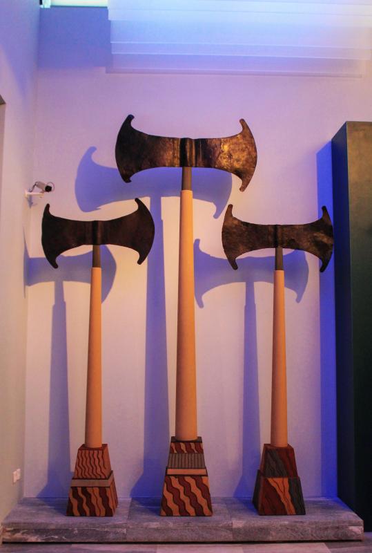 Just beside the bull-leaping fresco, on the left, you shall see the three oversized double axes.