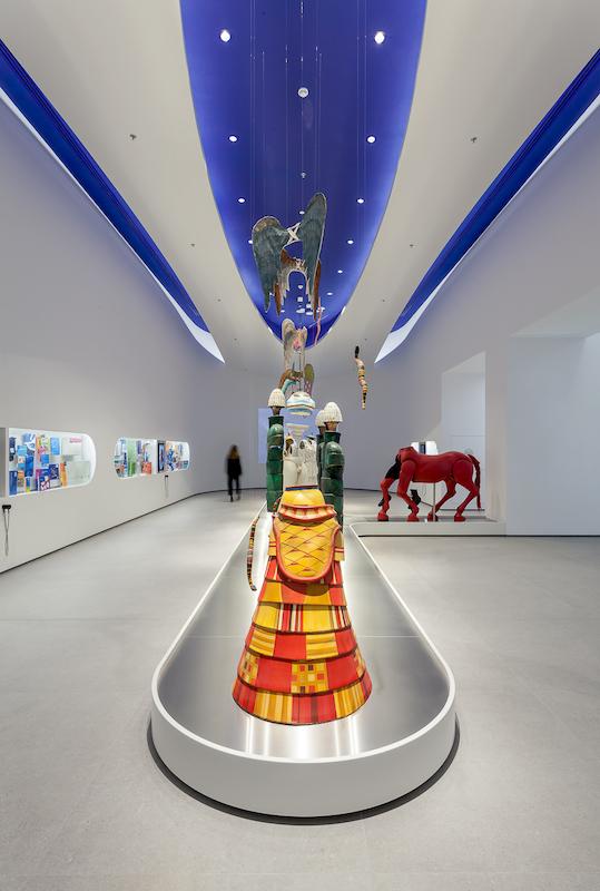 First is the costume of the Snake Goddess from Minoan Crete, consisting of a long skirt with layers in yellow, red, and orange tones, completed by two snakes suspended at the height of the arms. There follow the costumes of the Mycenaean warriors in the dark green color of oxidized bronze, with their boar’s tusk helmets. The Archaic and Classical periods are presented through the white costumes of the Kouroi, taking a step forward with their left foot, and also the famous Caryatids with their women’s chitons. Vivid colors and rich fabrics characterize the costumes of Hellenistic-era women, called “Tanagra women”, as well as the attire of the Byzantine period. At the end of the corridor, we find the costume of the Red Centaur, one of the most impressive costumes of the Opening Ceremony, which you can explore by touch.