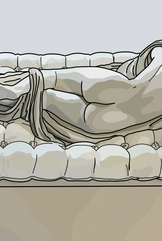 While facing Venus de Milo, leave room N° 345 to your right and walk across the corridor to the door in front of you. The entrance leads to the Caryatids room (N°348). Enter and turn immediately to the right. The Sleeping Hermaphroditus is right past the monumental chimney.