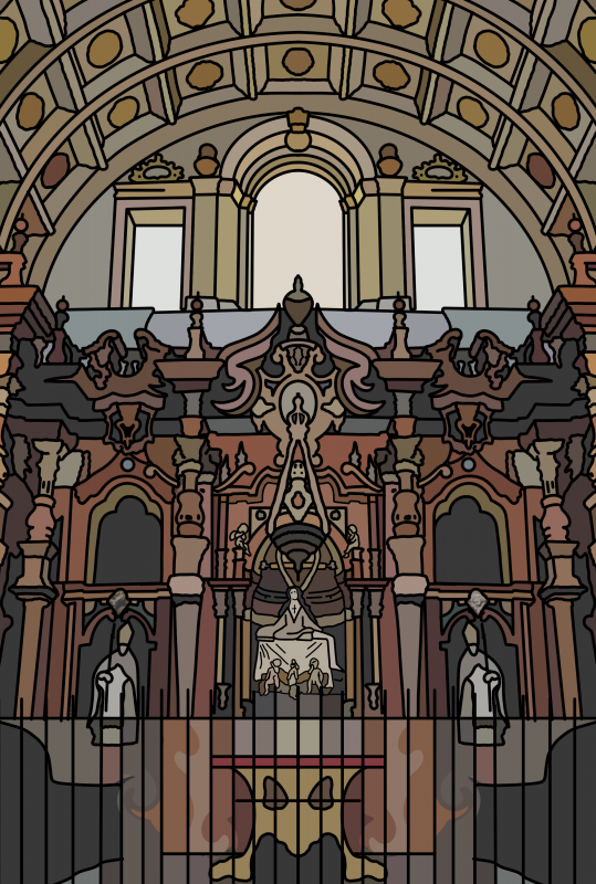 From the central nave looking at the organs, move to your right, towards the Forgiveness Portal, then turn left till you are in front of Our Lady of Sorrow, your next destination.