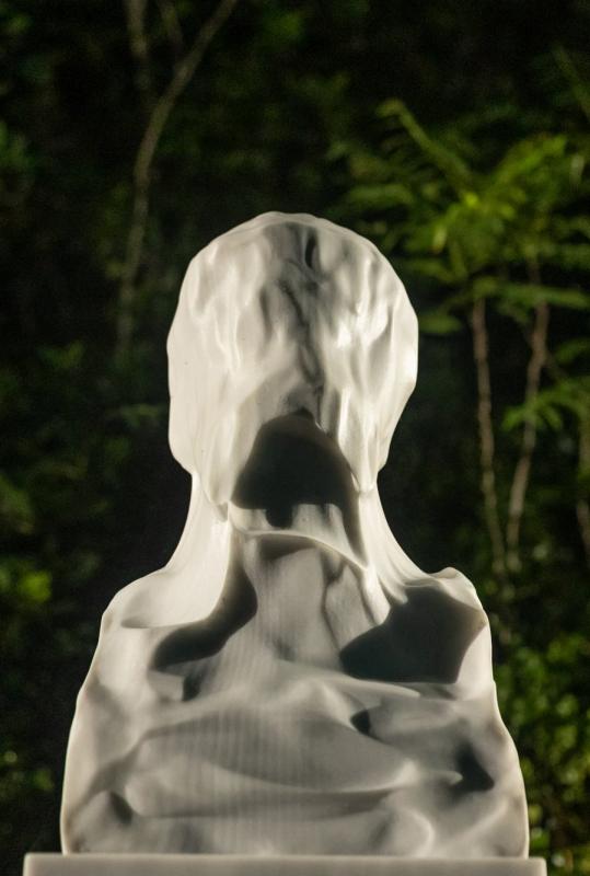 Alexandros Pallis, a proponent of Demotic Greek, printed the translation of the Gospels in Alexandria, the republication of which led to the violent protests known as “Evangelika” (Gospel riots). The bust made by the great sculptor Constantin Dimitriadis was placed in that spot in 1935, and since then, the embedding of time, the corrosion from vegetation and lichens, have made it a part of the city’s natural history. Next to Helin, a sculpture created algorithmically from thousands of 3D models of busts, it raises the question AI’s ability to amplify or erase not just our biases but also our own beliefs.