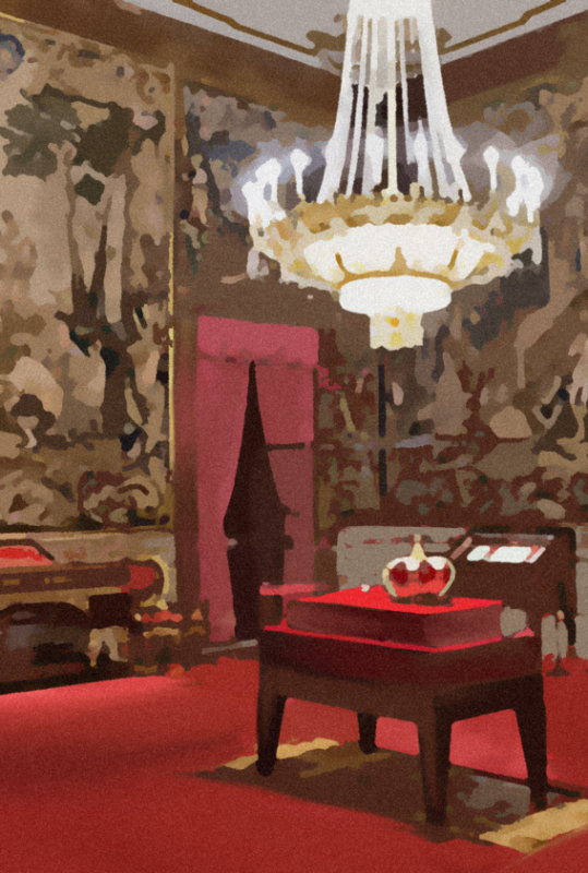 On the left wall of Maria Cristina’s Antechamber, you will find a door leading to the Crown Room. The first showcase on your left contains the Order of the Golden Fleece collar. Make your way around the room to see the crown and sceptre, and don’t miss the Table of the Sphinxes before you exit the chamber.