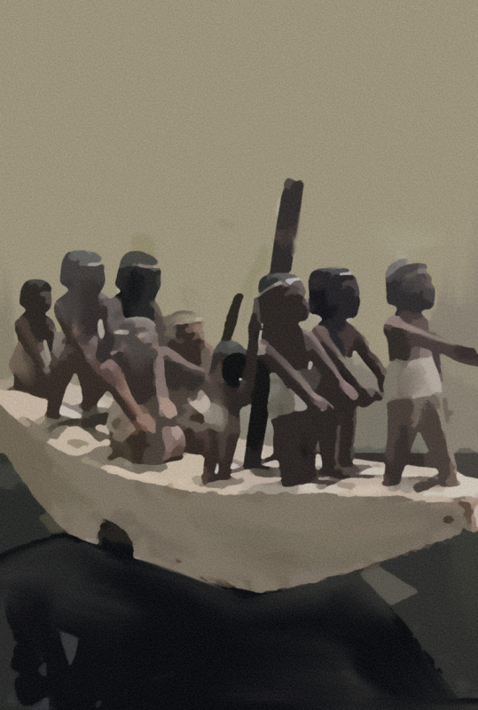 Turn around and walk a few steps towards the opposite wall. Turn left, and stand in front of the glass box - it’s the one with a boat inside.