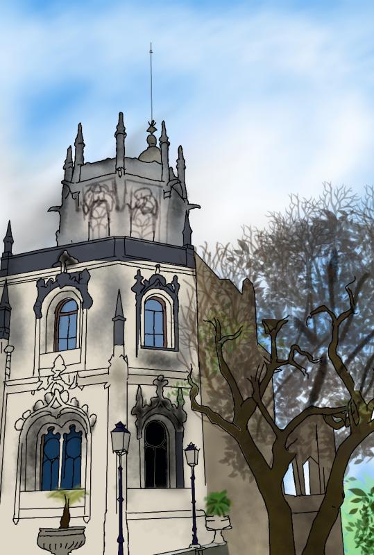 Again, make sure you are standing in front of the Lion’s profile (you want to see him looking left!). Now, you are going to walk around it. Take that path up until you reach the intersection; there, while facing the wall, take the right and continue the way up. Ignore every small path you see on the way – you must keep going forward and keep on the path going up. This will take you back to the Chapel of the Holy Trinity. There, stand with your back to the Chapel, you will see, on your right, a magnificent construction of Neo-Manueline and Neo-Gothic style. That is the Palace. Go stand in the patio facing its façade to learn more about it.