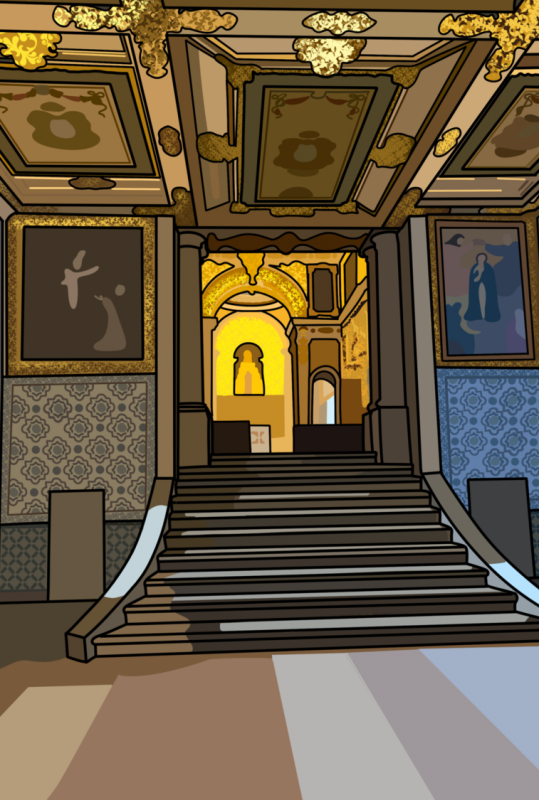 Return to the cloister and enter the room on the right-hand side of the chapel.