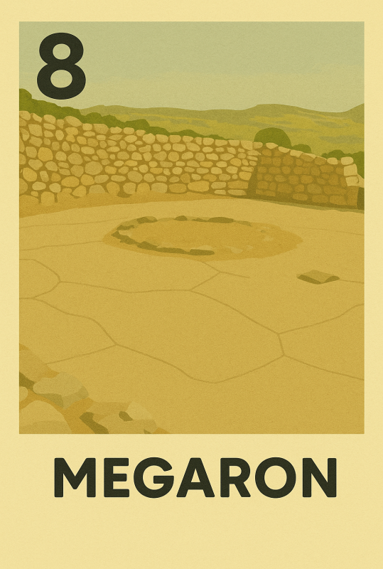 The palace, a symbol of power of the Mycenaean kings, dominates the highest point of the acropolis. It is constructed on artificial terraces, with the main access via a grand staircase starting from the Lion Gate. The official quarters of the palace include the large courtyard, the guesthouse, and the core of the complex, the Mycenaean megaron, comprising three sections: the hall, the antechamber, and the chamber where the ruler's throne was situated, along with a central hearth surrounded by four columns. Other buildings within the palace complex are associated with the monopolistic administration system of the Mycenaeans, primarily storage and production areas, royal workshops, worship spaces, and residences presumably belonging to officials. It was constructed in the 14th century B.C.E. on the foundations of a pre-existing structure that had been built approximately two centuries earlier.