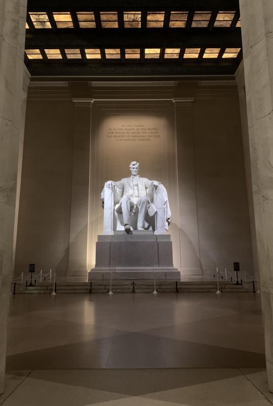 The Memorial’s interior is richly adorned. The walls are of light brownish-yellow Indiana limestone, while Tennessee pink marble was used for the floor and the statue pedestal. The ceiling has bronze girders ornamented with rosettes and sprigs of laurel and oak in relief. The Alabama marble between the rafters was saturated with melted beeswax to improve translucency and complement the natural light. Greek Ionic columns divide the interior into three chambers.