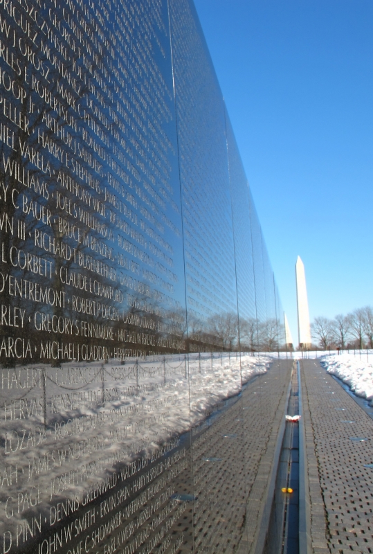 The Vietnam Veterans Memorial honors members of the U.S. armed forces who served in the Vietnam War. The memorial consists of two black granite walls engraved with the names of dead and missing service members. Each wall is 246 feet 9 inches (75.21 meters) long and has 72 polished panels pointing to the Washington Monument and the Lincoln Memorial. The panels start at ground level and sink lower before rising again to symbolize a wound slowly healing. The Memorial, dedicated in 1982, was designed by the architect Maya Lin.